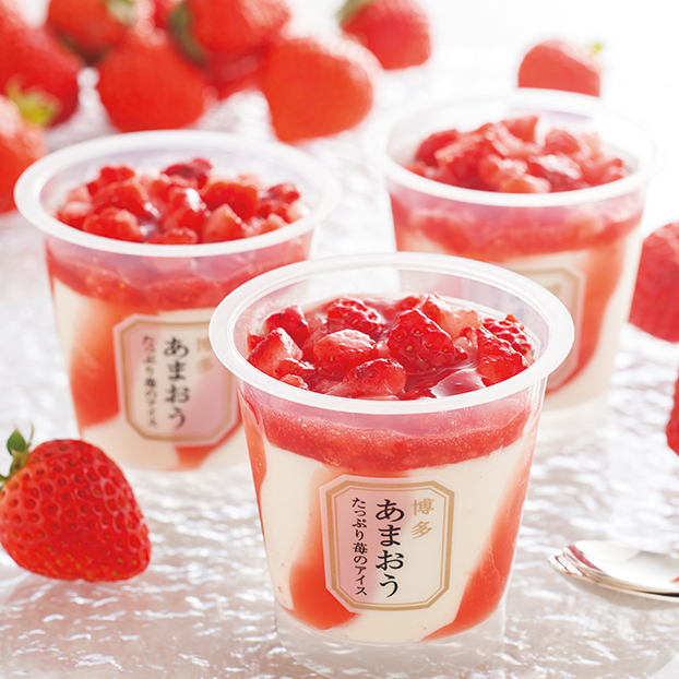 「博多あまおう」のソースが入ったアイスの上に、ごろっと果肉をのせた苺づくしのアイスです。