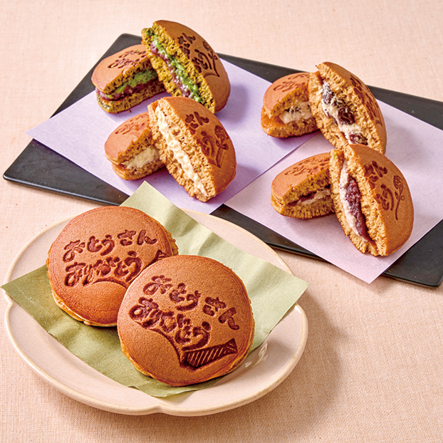 4種類の生どら焼きに感謝の気持ちを込めたメッセージの焼印をつけてお届けします。
